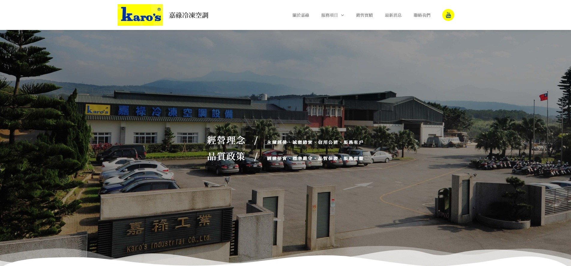為嘉祿冷凍空調(karo’s)設計的企業形象網站,以工廠實景攝影作為首頁視覺,呈現品牌在冷凍空調製造領域的規模與實力。網站整合公司簡介、服務項目與聯絡資訊,採清晰的版面規劃協助企業客戶快速了解品牌背景。