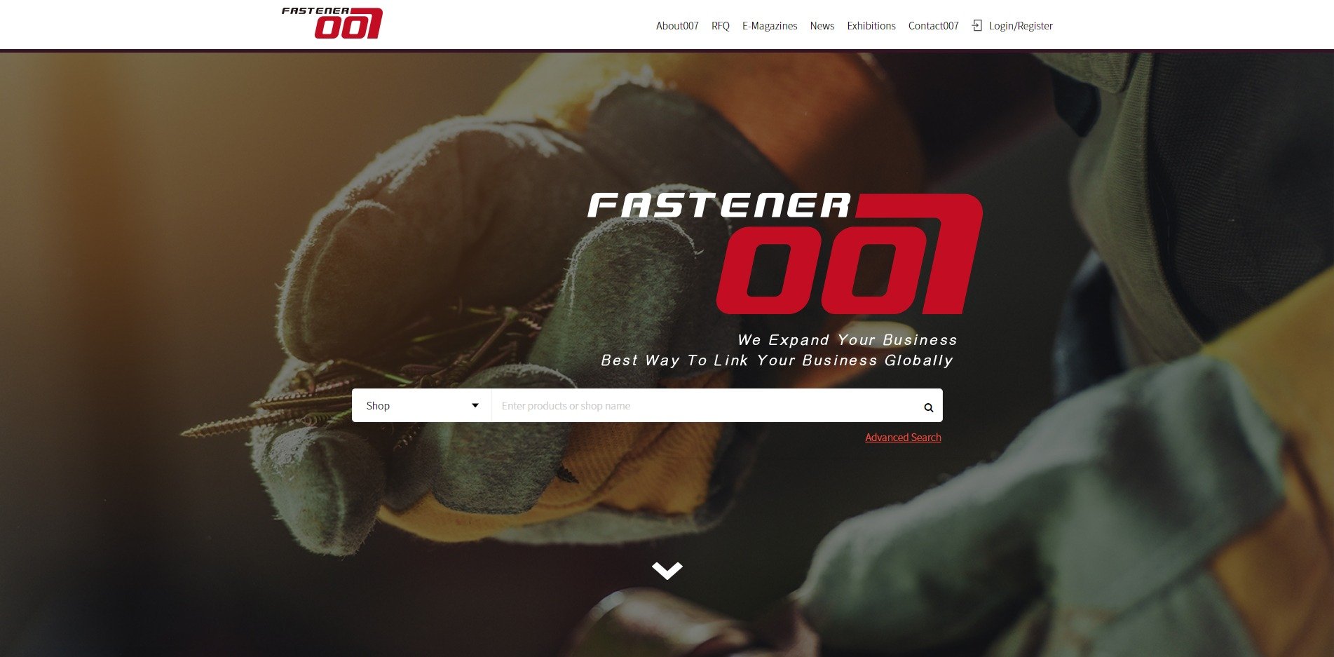 為 FASTENER 007 設計的螺絲緊固件 B2B 採購平台官網,以工業質感的深色視覺搭配鮮明的紅色品牌標誌,呈現專業可靠的國際貿易形象。「We Expand Your Business Globally」的主張清晰傳達平台商業價值,提供 RFQ、電子雜誌與展覽等全方位採購服務。